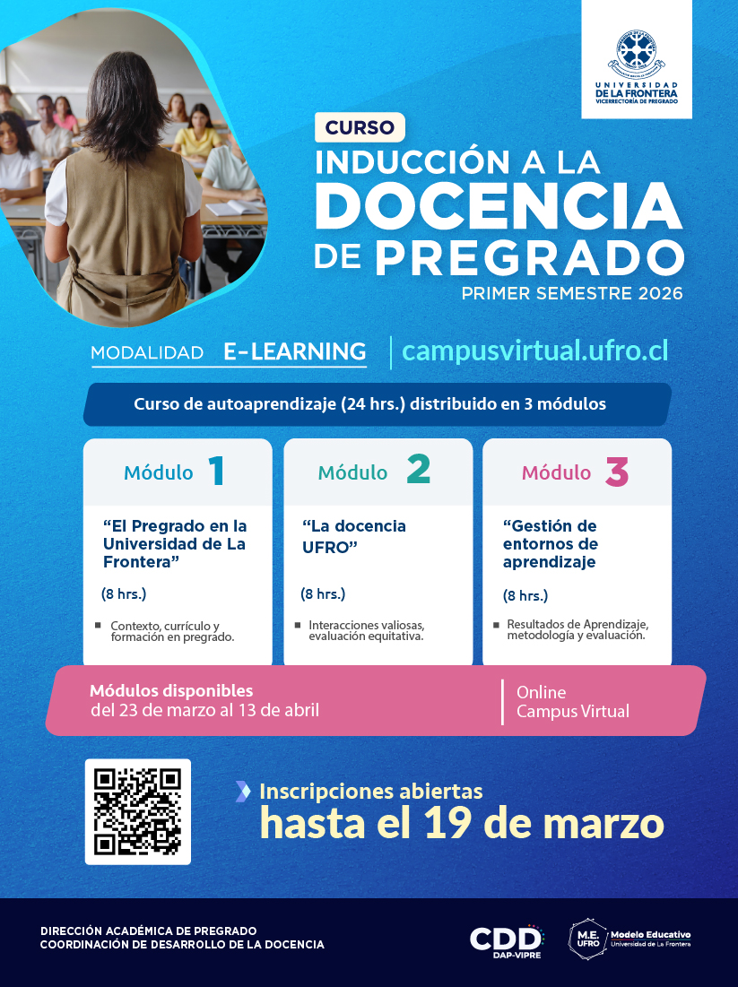Este curso busca apoyar a los(as) docentes nuevos y nuevas en una adecuada inserción, proporcionándoles los lineamientos institucionales de la docencia de pregrado en función del logro de resultados de aprendizaje, con apoyo de herramientas digitales de gestión necesarias para iniciar sus prácticas docentes en la Universidad de La Frontera.